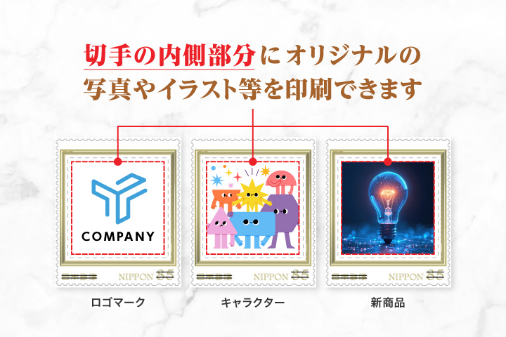 オリジナル フレーム切手は、切手のフレーム内にお好きな写真やイラストを印刷できる、カスタマイズ可能な切手です。企業ロゴやキャラクター、新商品のビジュアルなどを活用することで、郵送物が広告ツールとして機能し、ブランドの認知拡大に貢献します。
